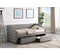 The grey scrolled bed features meticulous button-back detail on both the headboard and footboard, turning it into a work of art.